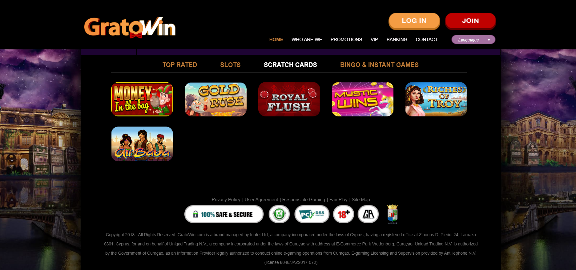 GratoWin è un casinò online di proprietà e gestito da Inafet Ltd. e certificato dal governo di Curaçao.