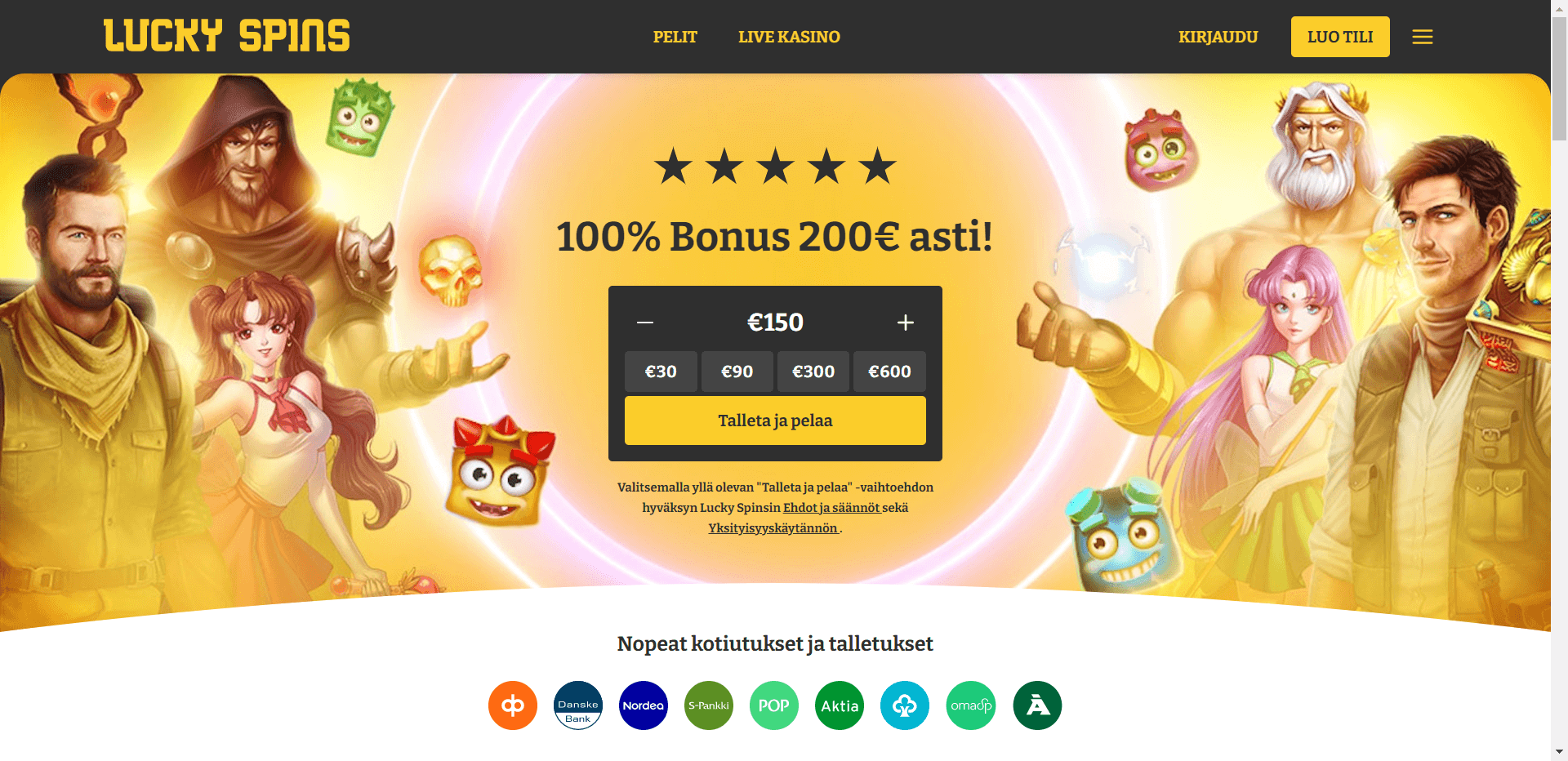 Det du finner hos Lucky Spins er en rekke andre kampanjer rettet mot tilbakevendende spillere, så det kan være ganske lukrativt å komme tilbake med en ny bonus. Boost Mid Week-tilbudet er veldig populært, ettersom det gir alle innskudd gjort på onsdag eller torsdag et personlig insentiv på 35x omsetningskravet. Alt du trenger å gjøre er å besøke og legge til penger på kontoen din. I helgene kan du åpne Daily Spins Galore-tilbudet, hvor du kan få opptil 150 gratis spinn mellom fredag og søndag. Det finnes også en Monday Money Boost hvor du samler lodd som du kan bytte mot en pengepremie. Hvert innskudd på $10 betyr én lodd, og hver femte lodd kan innløses mot $5 i bonuspenger. Ruby Lot of Money er et annet casinonettsted med spennende spesialbonustilbud, som deres $1-tilbud som gir 40 gratisspinn på Queen of Alexandria. Trenger jeg en Lucky Spins casinokampanjekode? Du trenger ikke en Lucky Spins-insentivkode for å aktivere fordelene dine, men du må melde deg på når som helst. Når du registrerer deg, må du sørge for at du aktiverer velkomstbonusen ved å gjøre krav på den fra belønningsdelen før du foretar din første innbetaling. Alle andre kampanjer kan aktiveres fra samme område. I all rettferdighet fjerner de fleste casinonettsteder nå bonuskoder, og Casitsu er et nettsted som fortsatt tilbyr dem. Spill og programvare: en utrolig spillhall med over 5000 titler Spilltype Antall spill Populære titler Spilleautomater 4200+9 Masks of Fire, Big Bass Splash, Wild Flock 2 Jackpots 20+ Joker Jackpots, Rainbow Jackpots, Jackpot Pursuit, Blackjack 125 +Rapid Multi-Hand Blackjack, Eclipse Blackjack, Blackjack Touch Live roulette 150+Auto Live Roulette, European Roulette, Roulette Advanced Andre bordspill 75 +Huge Baccarat, Casino Poker Side Wagers Online dealer-spill 700 +Crazy Time, Speed Roulette, SuperStake Blackjack En betydelig fordel med